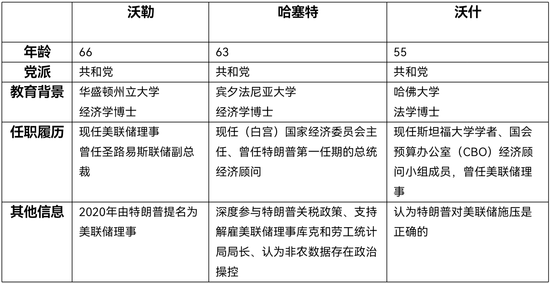 据美国媒体报道,特朗普心中已有三位属意的美联储主席人选,分别是现任美联储理事克里斯托弗·沃勒、现任白宫国家经济委员会主任凯文·哈塞特和前美联储理事凯文·沃什。